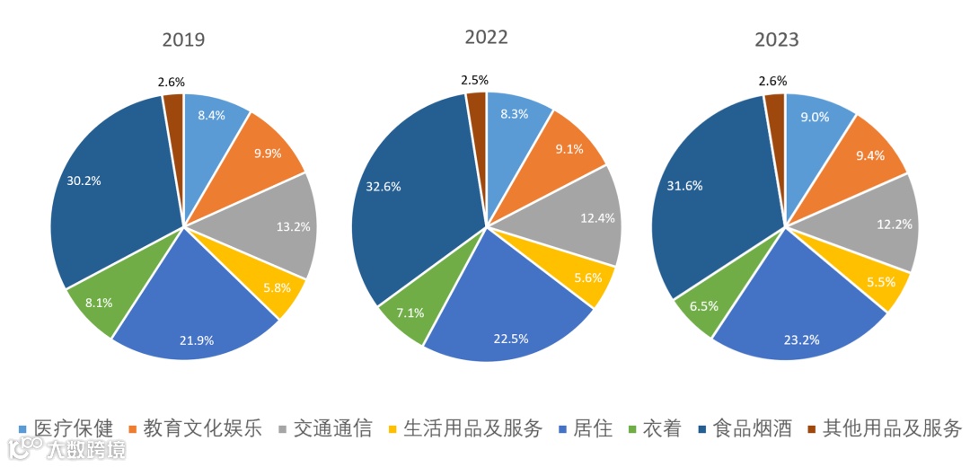 图3. 2019年、2022年、2023年一季度国内居民消费支出结构对比