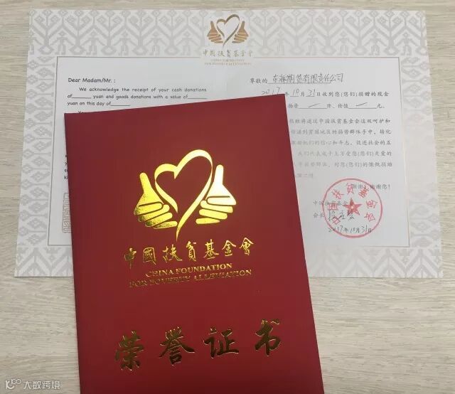图为中国扶贫基金会颁发给我司的捐赠证书