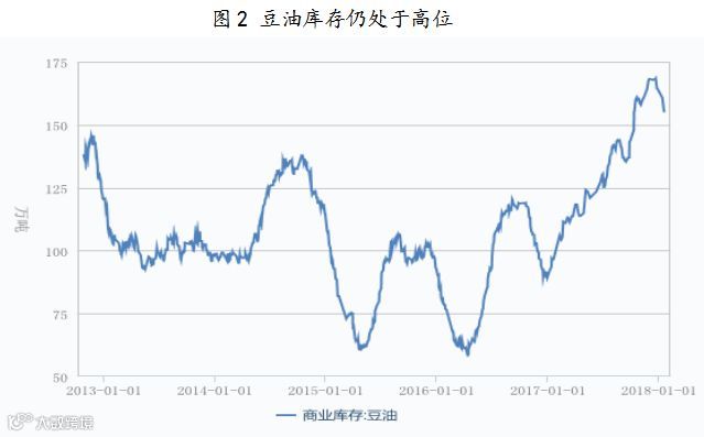 不过,由于近几个月以来,大豆压榨利润良好,使得油厂源源不断的进口国外大豆,使得大豆到港量持续较大,据Cofeed统计,2018年1月份国内各港口进口大豆预报到港124船809万吨,原料供应十分充裕,油厂积极开机,上周大豆压榨产能利用率为55.8%,较上周增加2.6个百分点。未来两周将进入豆粕的节前备货期,油厂开机率保持在高水平,周度压榨量分别在195万吨、198万吨。加上,国内豆油成交量逐渐减少,购销放缓令豆油库存的压力并未有明显的改善。棕榈油方面,截止上周五,全国港口食用棕榈油库存总量63.01万吨,而根据最新调查,2018年1月棕榈油进口量预计40-43万吨,2月棕榈油进口量预计27-32万吨,在需求仍未明显启动的情况下,预计棕榈油库存进一步增加的可能性仍较大。