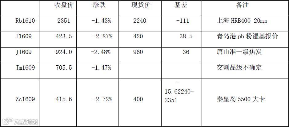 周二黑色期货价格大幅下跌。近期强弱比较顺序如下:
