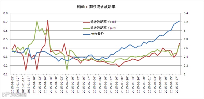 上个交易日,50ETF收盘小幅下跌,然而5月份合约涨跌不一。平值认购期权合约小幅上涨而认沽期权小幅下跌。这种现象可以根据隐含波动率来解释。在5月份平值期权附近的认购期权的隐含波动率普遍高于认沽期权,导致认购期权价格较高。目前几个月份的期权合约隐含波动率依然较高,反映出市场较高的风险和投资者谨慎的心态。从成交量来看,认沽期权有较明显的下降,而行权价格较高的几个认购期权的成交量较大。因此虽然从总体来看市场风险较大,但是通过比较认沽和认购期权合约我们依然可以看出投资者对市场并没有看空。我们建议投资者依然可以安心持有标的合约,并维持前段时间的持有标的的保护性慢涨策略,不建议利用期权做方向上的高杠杆投机。