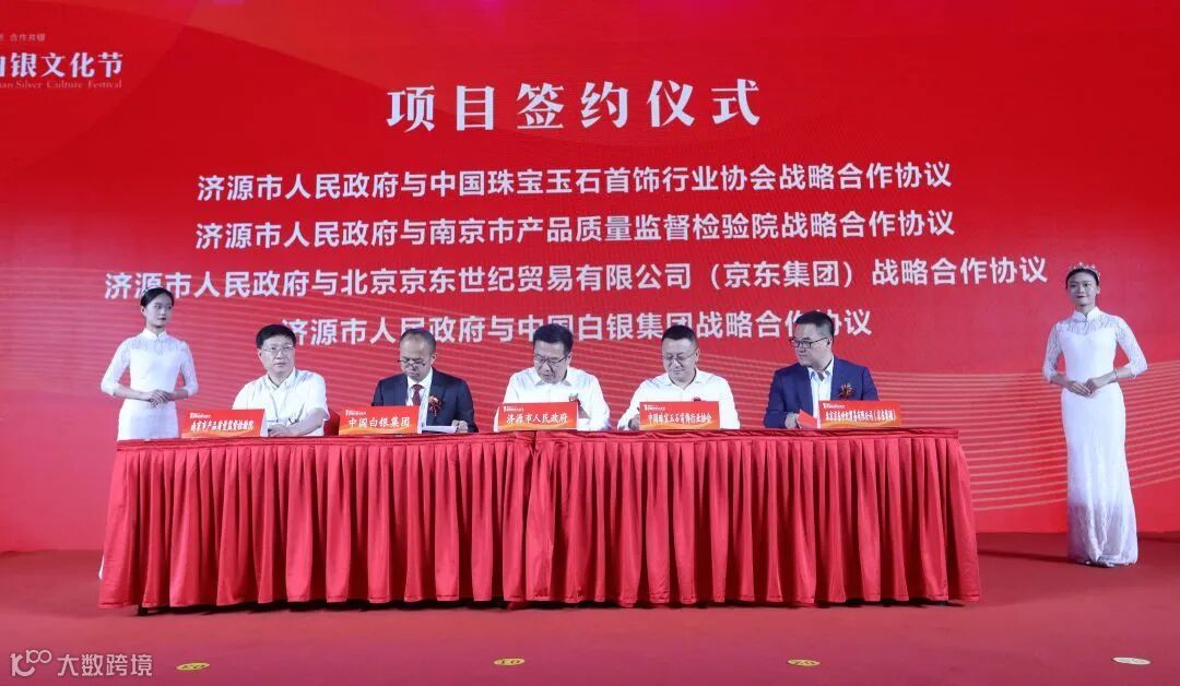 经过前期的广泛交流和深入对接,开幕式上,济源市人民政府与中国珠宝玉石首饰行业协会、南京市产品质量监督检验院、京东集团、中国白银集团等单位签订了合作协议,济风钻石、济源白银交收中心、中国白银商城、贵金属光电新材料、年产6吨钯、铂等贵金属综合回收利用、银基电极新材料等27个项目进行了签约。共计签约投资项目31个,总投资达21.6亿元。