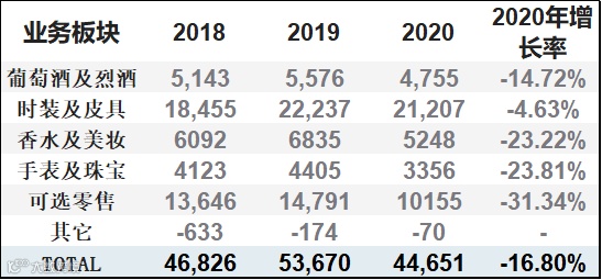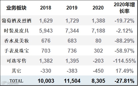 2020年LVMH集团总收入446.51亿欧元,同比下降16.81%;其中珠宝&手表板块收入33.56亿欧元,同比下降23.81%,占集团总收入的比重由前一年的8.21%下降至7.52%。利润方面,2020年集团总经营利润为83.05亿欧元,同比下降27.81%,其中珠宝&手表板块经营利润为3.02亿欧元,同比降幅高达58.97%。