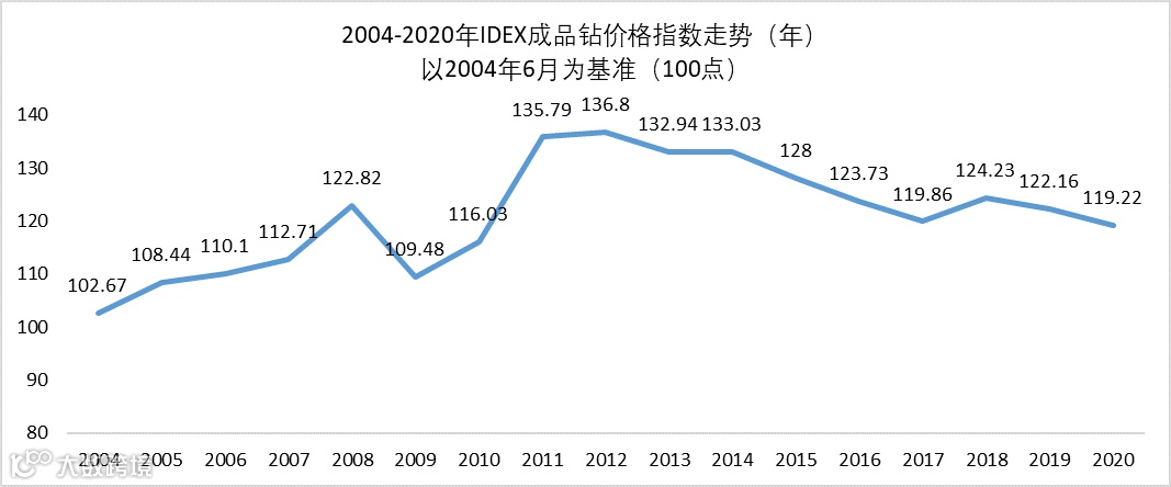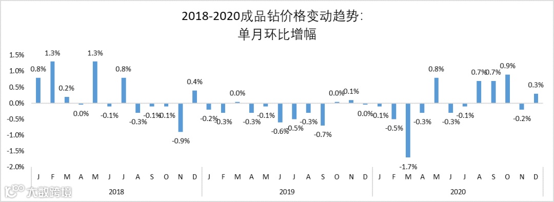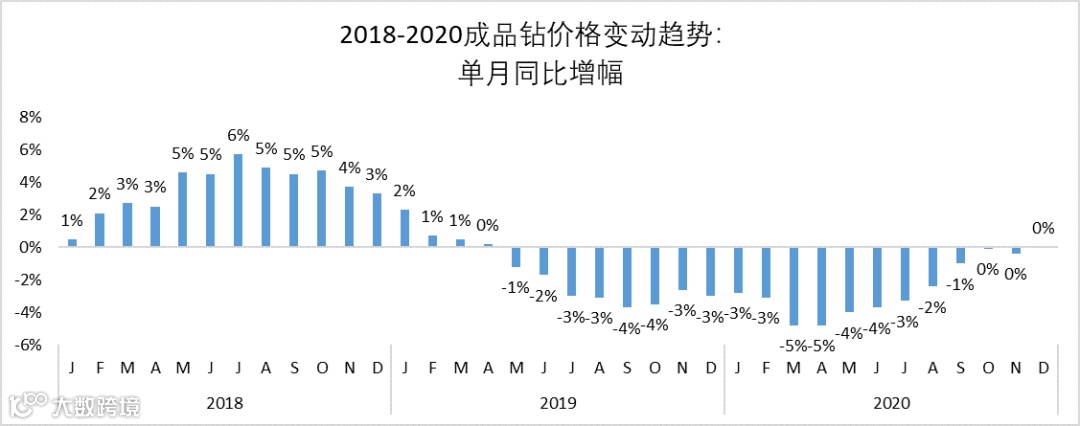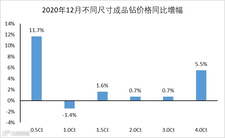 根据国际钻石线上交易平台IDEX数据显示,2020年12月成品钻价格同比增幅为0%——即意味着,在疫情影响下经历了数月的加速下跌后,成品钻的价格首次回到了疫情前的同期水平。