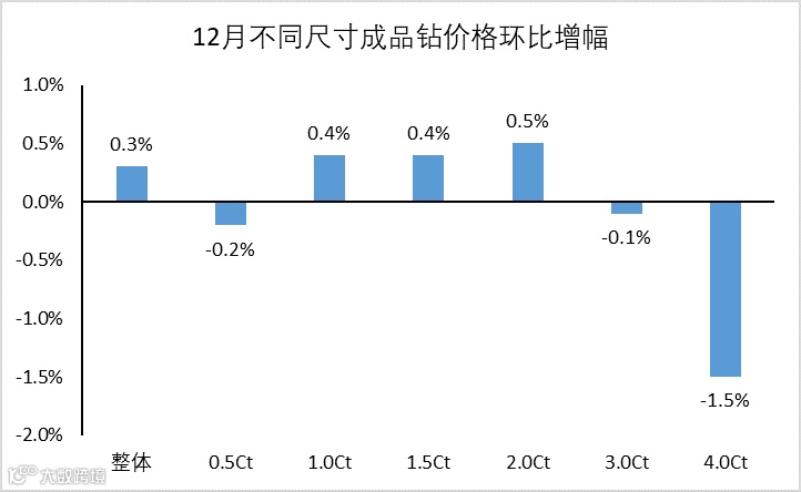 2020年12月的环比数据显示,1.0~2.0克拉的成品钻表现较好,平均价格较上月增长0.4~0.5,而其它尺寸的钻石价格则都出现一定下降。