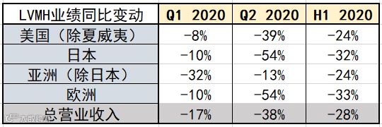 LVMH在2020年上半年共实现销售收入184亿欧元,同比下降28%。继第一季度销售收入同比下降17%后,第二季度销售收入降幅扩大至38%;经常性活动盈利同比下降68%至16.7亿欧元,集团净利润同比下降84%至5.2亿欧元。