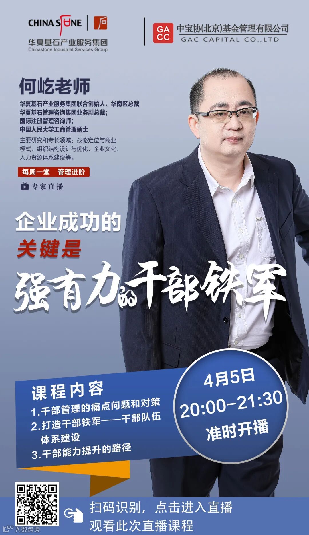 前四期课程分别从企业营销、文化建设、团队绩效和激励方式四个方面进行了讲解,受到企业家朋友们的广泛关注,本期课程我们邀请到了华夏基石产业服务集团联合创始人、华南区总裁何屹老师就企业干部管理与大家分享!