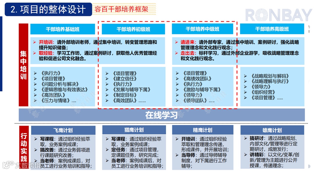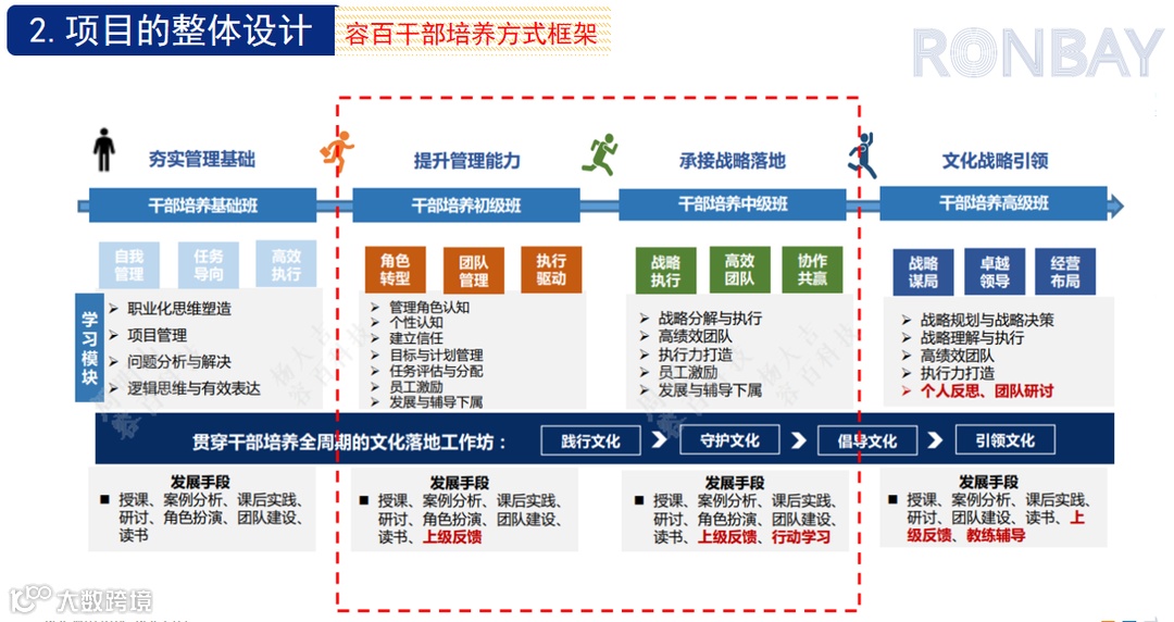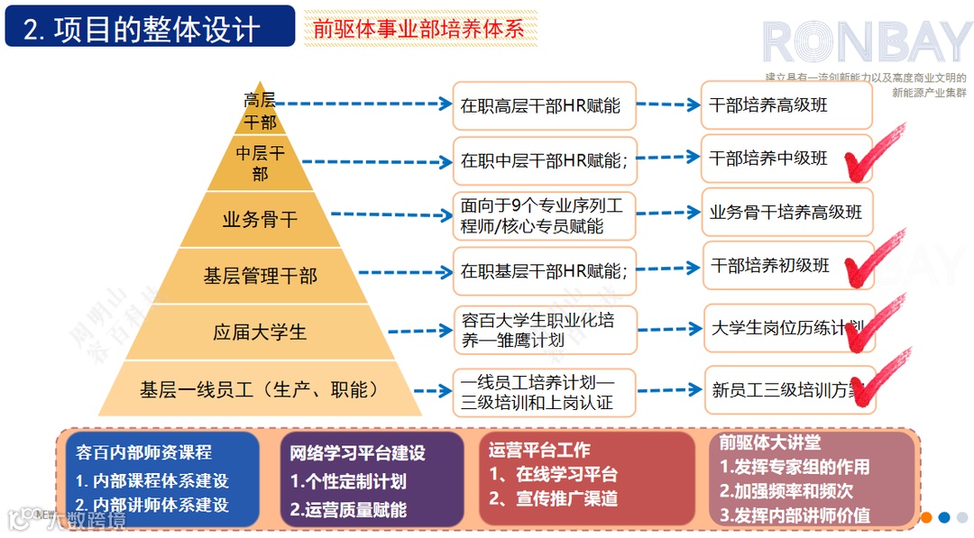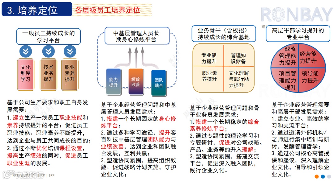 培训方案由人事部门牵头,各部门参与共同制定。其内容囊括了价值观、行为模式、沟通技巧、工艺技术、管理技巧等方面的知识,它们为夯实各级人才梯队的人员能力建设提供了保障。