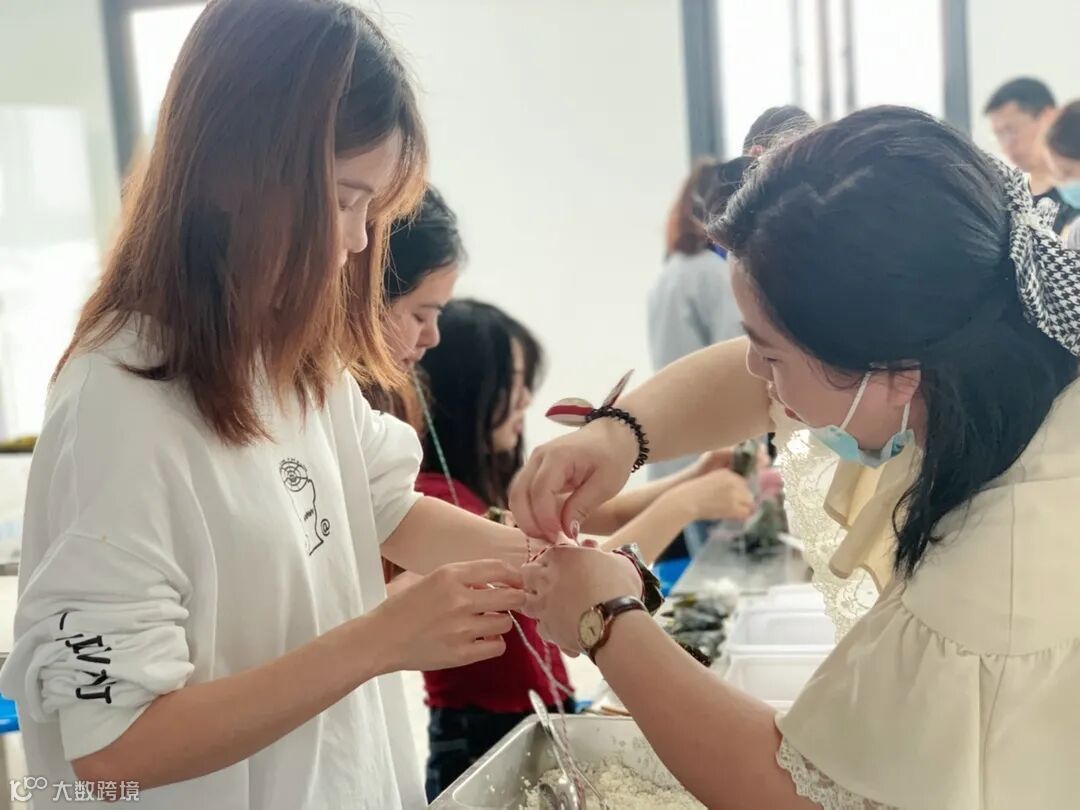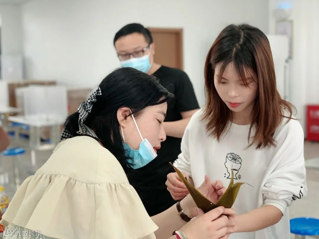 大家一边包粽子,一边交流经验,动作也从生疏到了娴熟,一片片粽叶在他们的手中上下翻飞、弯曲折叠。