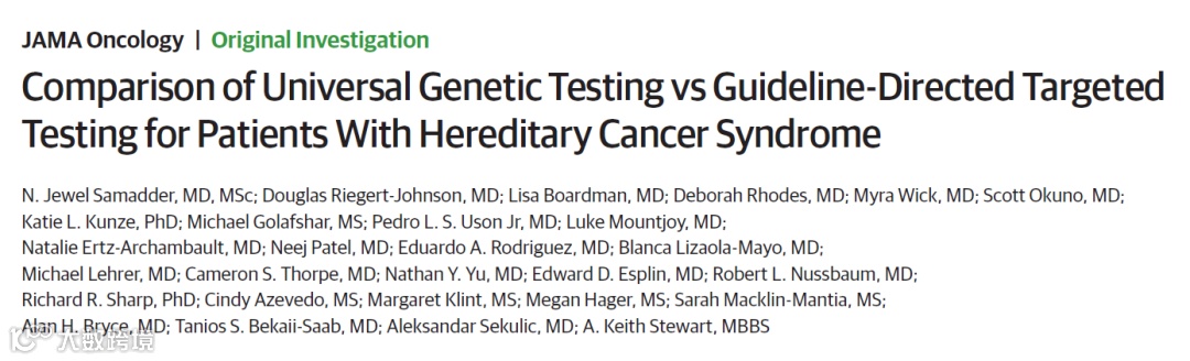 2020年10月,JAMA Oncology 杂志发表了来世界排名第一的梅奥医学中心的题为:Comparison of Universal Genetic Testing vs Guideline-Directed Targeted Testing for Patients With Hereditary Cancer Syndrome 的研究论文。