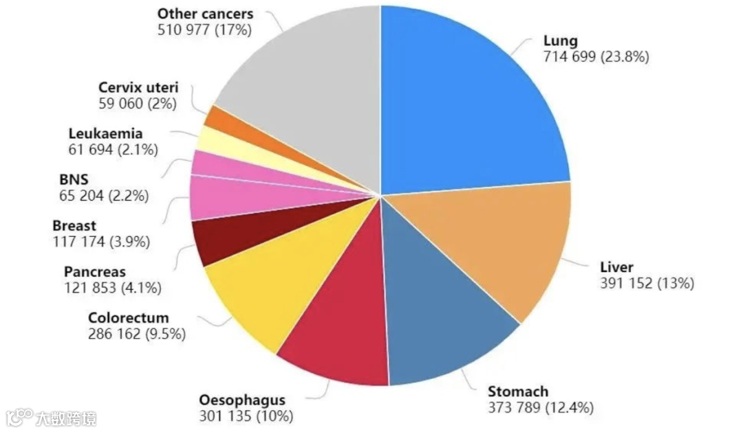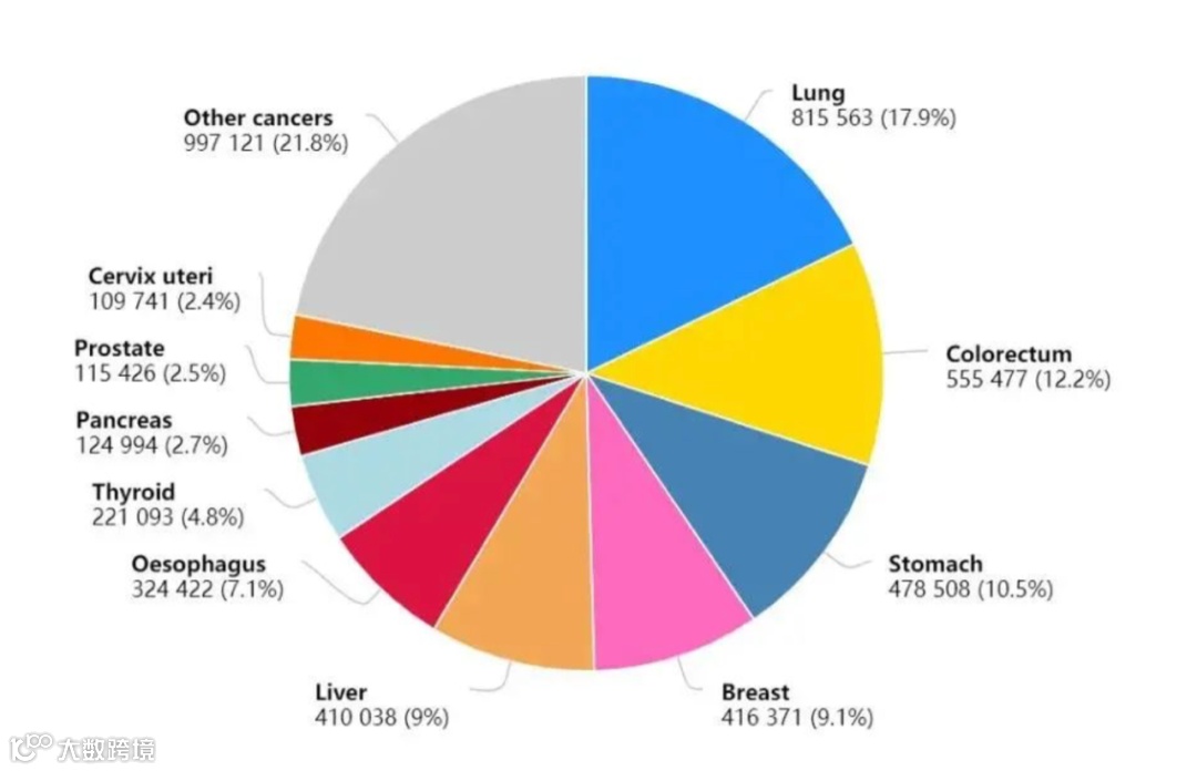 2020年中国癌症新发病例数前十的癌症分别是:肺癌82万,结直肠癌56万,胃癌48万,乳腺癌42万,肝癌41万,食管癌32万,甲状腺癌22万,胰腺癌12万,前列腺癌12万,宫颈癌11万,这十种癌症占新发癌症数的78%。