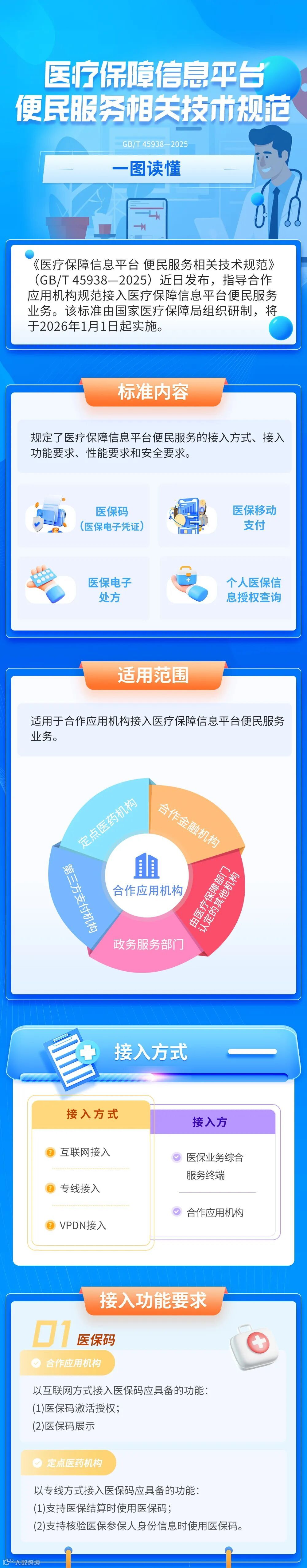 近日,市场监管总局(国家标准委)发布《医疗保障信息平台 便民服务相关技术规范》(GB/T 45938—2025)。该标准由国家医疗保障局组织研制,是我国医疗保障领域的首项国家标准,标志着我国医保标准化建设取得里程碑式突破。标准将于2026年1月1日起实施。