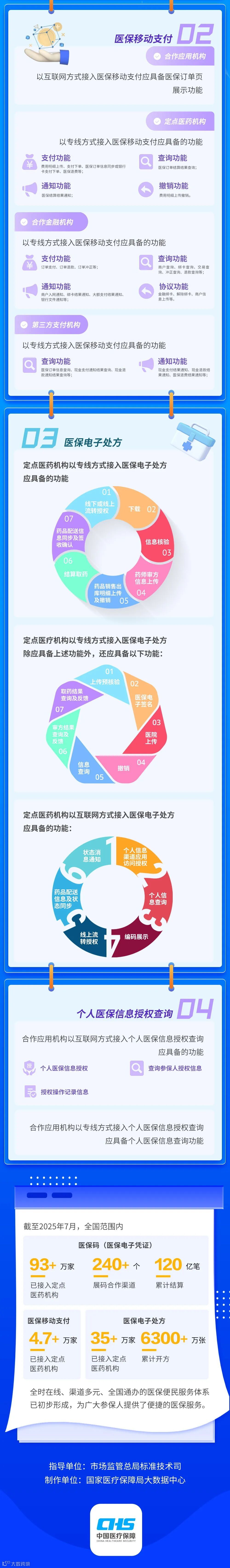 截至2025年7月,全国范围内,医保码(医保电子凭证)已接入定点医药机构超过93万家、接入展码合作渠道240余个、累计结算120亿笔;医保移动支付接入机构4.7万家;医保电子处方接入机构超过35万家,累计开方6300余万张。医疗保障信息平台便民服务的发展是医保信息化发展的一个缩影。6年时间,从无到有,从有到优,持续升级。在已接入医疗保障信息平台便民服务的定点医药机构,群众通过手机或刷脸,就能轻松办理挂号、就医、检查化验、打印报告单、拿取药品、办理住院、电子处方流转及医保结算等全场景全流程就医购药业务。全时在线、渠道多元、全国通办的医保便民服务体系初步形成,为广大参保人提供了便捷的医保服务。