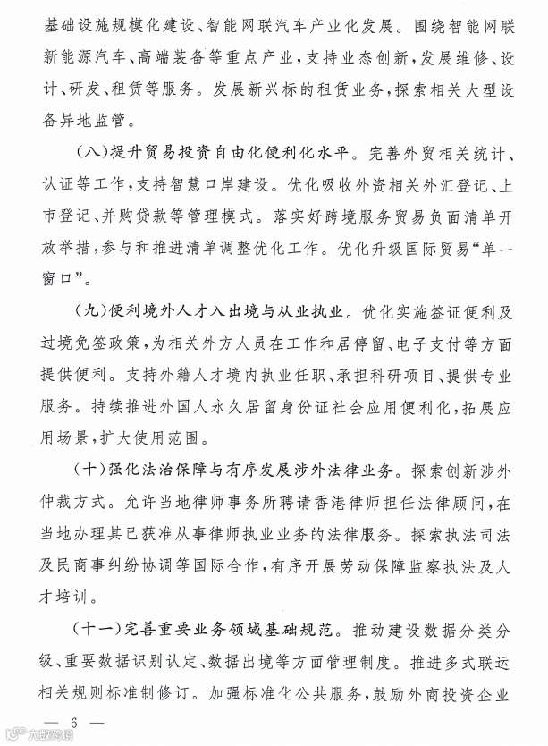二是在完善要素保障方面,围绕过境免签、永久居留、支付便利、执业资格认可等方面提出试点任务,便利境外人才入出境与从业执业;围绕涉外仲裁、律师执业、国际司法合作、劳动保障监察执法、人才培养培训等方面,强化法治保障,有序开展涉外法律业务。