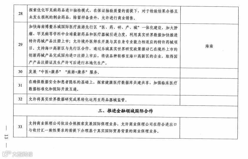 在医疗领域,提出支持外籍医生开设诊所;境外医疗专业技术人员短期执业;支持开办外资护理学院;允许以捐资方式举办非营利性医疗机构、养老机构;支持建设基因与细胞治疗专利专题数据库;探索优化罕见病药品进口抽检模式等。