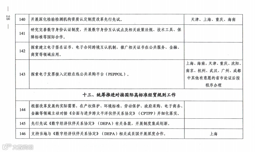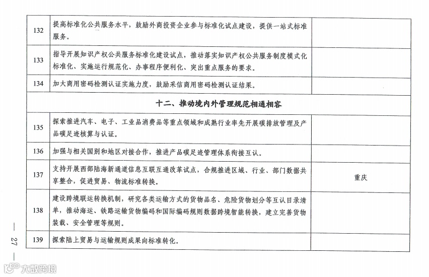 三是在推动规则、规范相通相容方面,在数据跨境流动、标准制定、知识产权、商用密码等重要业务领域,不断完善基础规范;在碳排放、碳足迹管理、跨境货物联运、检验检测机构资质、数字身份、电子发票等领域推动境内外管理规范相通相容等。