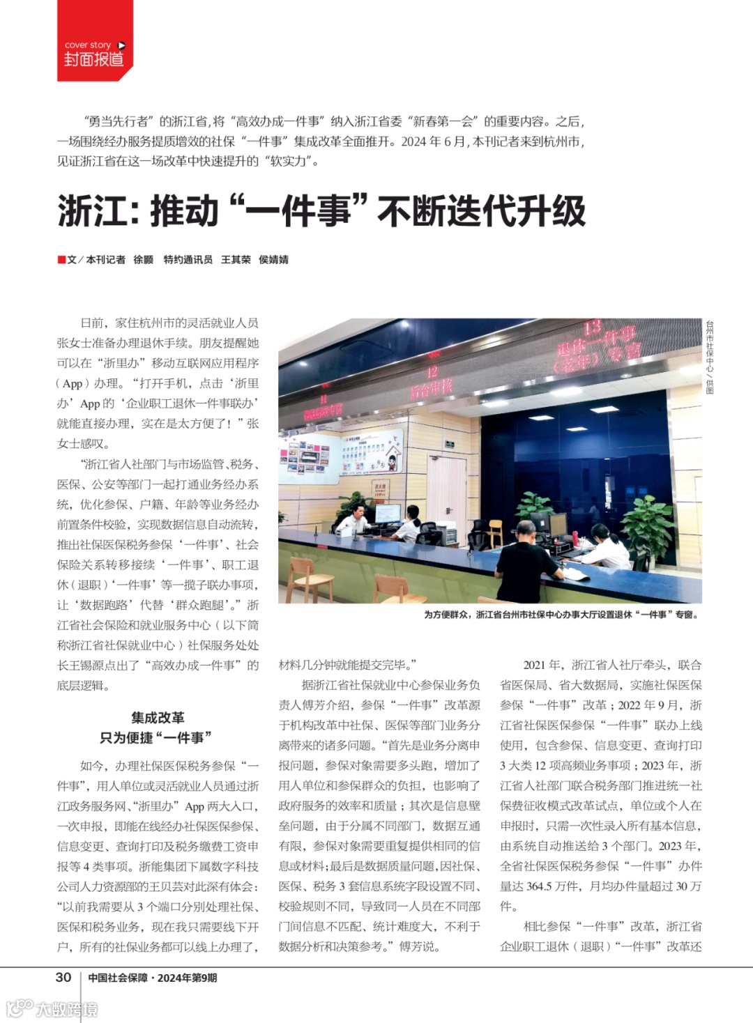 “勇当先行者”的浙江省,将“高效办成一件事”纳入浙江省委“新春第一会”的重要内容。之后,一场围绕经办服务提质增效的社保“一件事”集成改革全面推开。2024年6月,本刊记者来到杭州市,见证浙江省在这一场改革中快速提升的“软实力”。