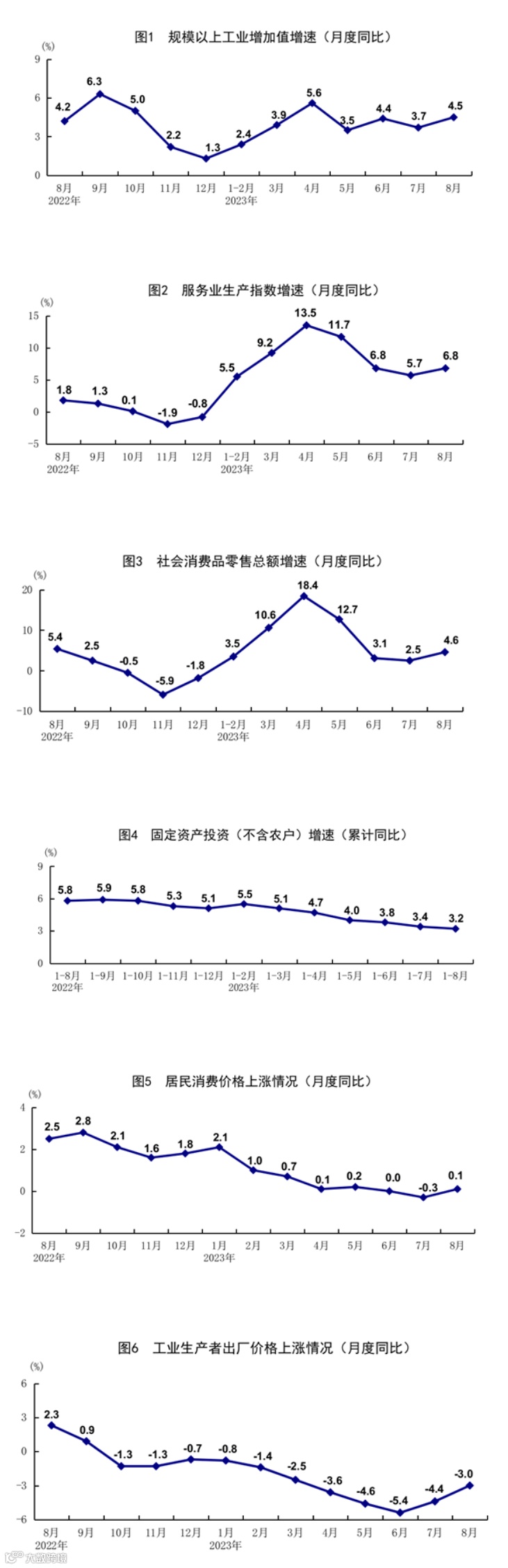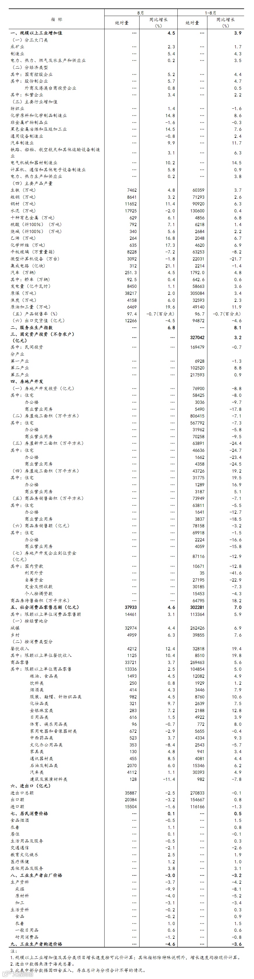 8月份,全国规模以上工业增加值同比增长4.5%,比上月加快0.8个百分点;环比增长0.50%。分三大门类看,采矿业增加值同比增长2.3%,制造业增长5.4%,电力、热力、燃气及水生产和供应业增长0.2%。装备制造业增加值同比增长5.4%,比上月加快2.1个百分点;高技术制造业增加值增长2.9%,加快2.2个百分点。分经济类型看,国有控股企业增加值同比增长5.2%;股份制企业增长5.7%,外商及港澳台商投资企业增长0.8%;私营企业增长3.4%。分产品看,太阳能电池、服务机器人、光电子器件产品产量同比分别增长77.8%、73.7%、29.9%。1-8月份,全国规模以上工业增加值同比增长3.9%。8月份,制造业采购经理指数为49.7%,比上月上升0.4个百分点;企业生产经营活动预期指数为55.6%。