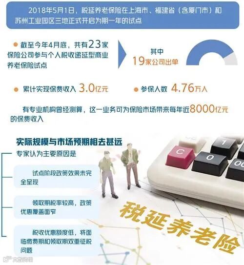 最新数据显示,截至今年4月底,共有23家保险公司参与个人税收递延型商业养老保险试点,其中19家公司出单,累计实现保费收入3亿元,参保人数4.76万人。税延养老保险虽然热度高,却遭遇“叫好不叫座”。