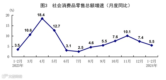 1-2月份,社会消费品零售总额81307亿元,同比增长5.5%。按经营单位所在地分,城镇消费品零售额70437亿元,增长5.5%;乡村消费品零售额10870亿元,增长5.8%。按消费类型分,商品零售71826亿元,增长4.6%;餐饮收入9481亿元,增长12.5%。升级类商品销售较快,在限额以上单位商品零售额中,通讯器材类,体育、娱乐用品类,汽车类分别增长16.2%、11.3%、8.7%。全国网上零售额21535亿元,同比增长15.3%。其中,实物商品网上零售额18206亿元,增长14.4%,占社会消费品零售总额的比重为22.4%。1-2月份,服务零售额同比增长12.3%。从环比看,2月份社会消费品零售总额比上月增长0.03%。