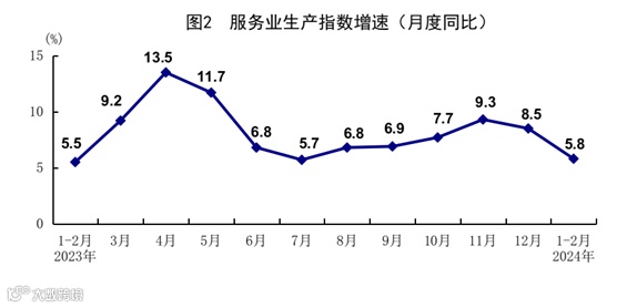 1-2月份,全国服务业生产指数同比增长5.8%。分行业看,住宿和餐饮业,信息传输、软件和信息技术服务业,金融业,交通运输、仓储和邮政业,批发和零售业生产指数同比分别增长12.1%、10.4%、8.2%、7.1%、7.0%。2月份,服务业商务活动指数为51.0%,比上月上升0.9个百分点;服务业业务活动预期指数为58.1%。其中,道路运输、航空运输、餐饮、货币金融服务、生态保护及公共设施管理、文化体育娱乐等行业商务活动指数均位于55.0%以上较高景气区间。