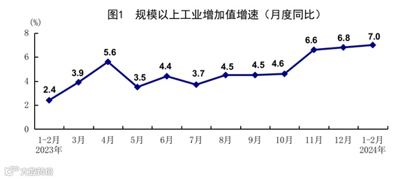 1-2月份,全国规模以上工业增加值同比增长7.0%,比上年12月份加快0.2个百分点。分三大门类看,采矿业增加值同比增长2.3%,制造业增长7.7%,电力、热力、燃气及水生产和供应业增长7.9%。消费品制造业增加值增长4.7%,比上年12月份加快4.4个百分点;高技术制造业增加值增长7.5%,加快1.1个百分点。分经济类型看,国有控股企业增加值增长5.8%;股份制企业增长7.3%,外商及港澳台投资企业增长6.2%;私营企业增长6.5%。分产品看,3D打印设备、充电桩、电子元件产品产量同比分别增长49.5%、41.8%、41.5%。从环比看,2月份规模以上工业增加值比上月增长0.56%。2月份,制造业采购经理指数为49.1%,企业生产经营活动预期指数为54.2%。