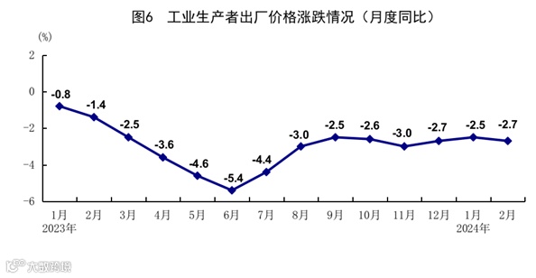 1-2月份,全国工业生产者出厂价格同比下降2.6%。分月看,1月份同比下降2.5%,环比下降0.2%;2月份同比下降2.7%,环比下降0.2%。1-2月份,全国工业生产者购进价格同比下降3.4%。