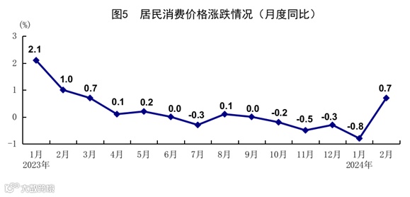 1-2月份,全国居民消费价格(CPI)同比持平,其中1月份下降0.8%,2月份上涨0.7%。分类别看,1-2月份,食品烟酒价格同比下降1.9%,衣着价格上涨1.6%,居住价格上涨0.3%,生活用品及服务价格上涨0.7%,交通通信价格下降1.4%,教育文化娱乐价格上涨2.6%,医疗保健价格上涨1.4%,其他用品及服务价格上涨2.9%。在食品烟酒价格中,猪肉价格下降9.1%,鲜果价格下降6.6%,鲜菜价格下降5.1%,粮食价格上涨0.4%。扣除食品和能源价格后的核心CPI同比上涨0.8%,其中2月份同比上涨1.2%,涨幅比上月扩大0.8个百分点。从环比看,1月份、2月份,全国居民消费价格分别上涨0.3%和1.0%。