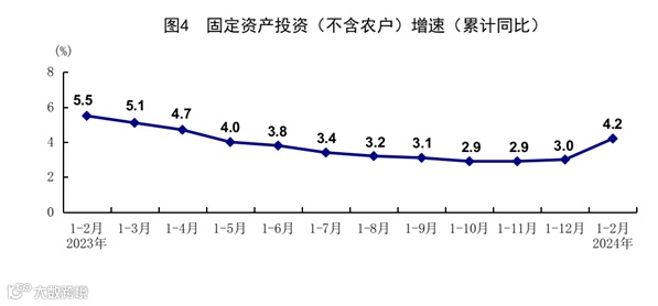 1-2月份,全国固定资产投资(不含农户)50847亿元,同比增长4.2%,比上年全年加快1.2个百分点;扣除房地产开发投资,全国固定资产投资同比增长8.9%。分领域看,基础设施投资同比增长6.3%,制造业投资增长9.4%,房地产开发投资下降9.0%。全国新建商品房销售面积11369万平方米,同比下降20.5%;新建商品房销售额10566亿元,下降29.3%。分产业看,第一产业投资同比下降5.7%,第二产业投资增长11.9%,第三产业投资增长1.2%。民间投资增长0.4%;扣除房地产开发投资,民间投资增长7.6%。高技术产业投资同比增长9.4%,其中高技术制造业和高技术服务业投资分别增长10.0%、7.8%。高技术制造业中,信息化学品制造业,航空、航天器及设备制造业投资分别增长43.2%、33.1%;高技术服务业中,专业技术服务业、信息服务业投资分别增长36.2%、16.1%。从环比看,2月份固定资产投资(不含农户)比上月增长0.88%。
