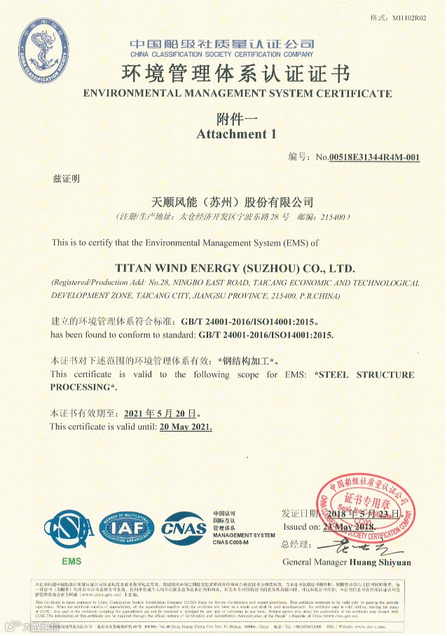 同时,天顺风能集团也非常重视生产过程中的环保与健康,各工厂严格按照既定环境保护标准和法规要求提供产品和服务,通过相关机构检测,获得《环境管理体系认证证书》。