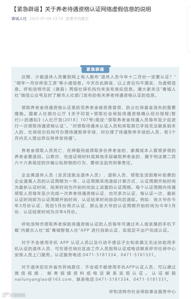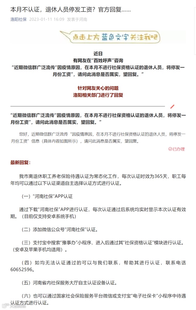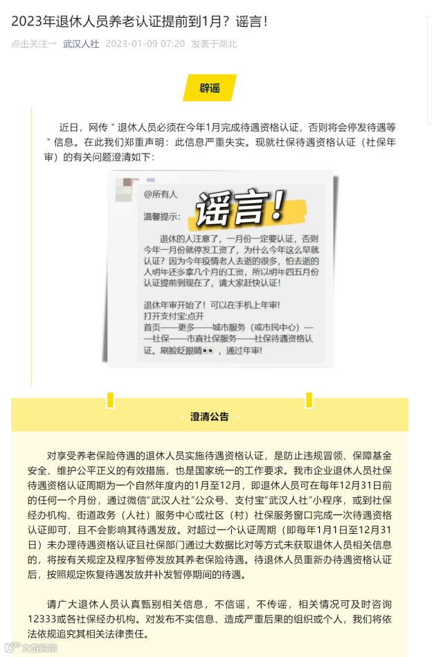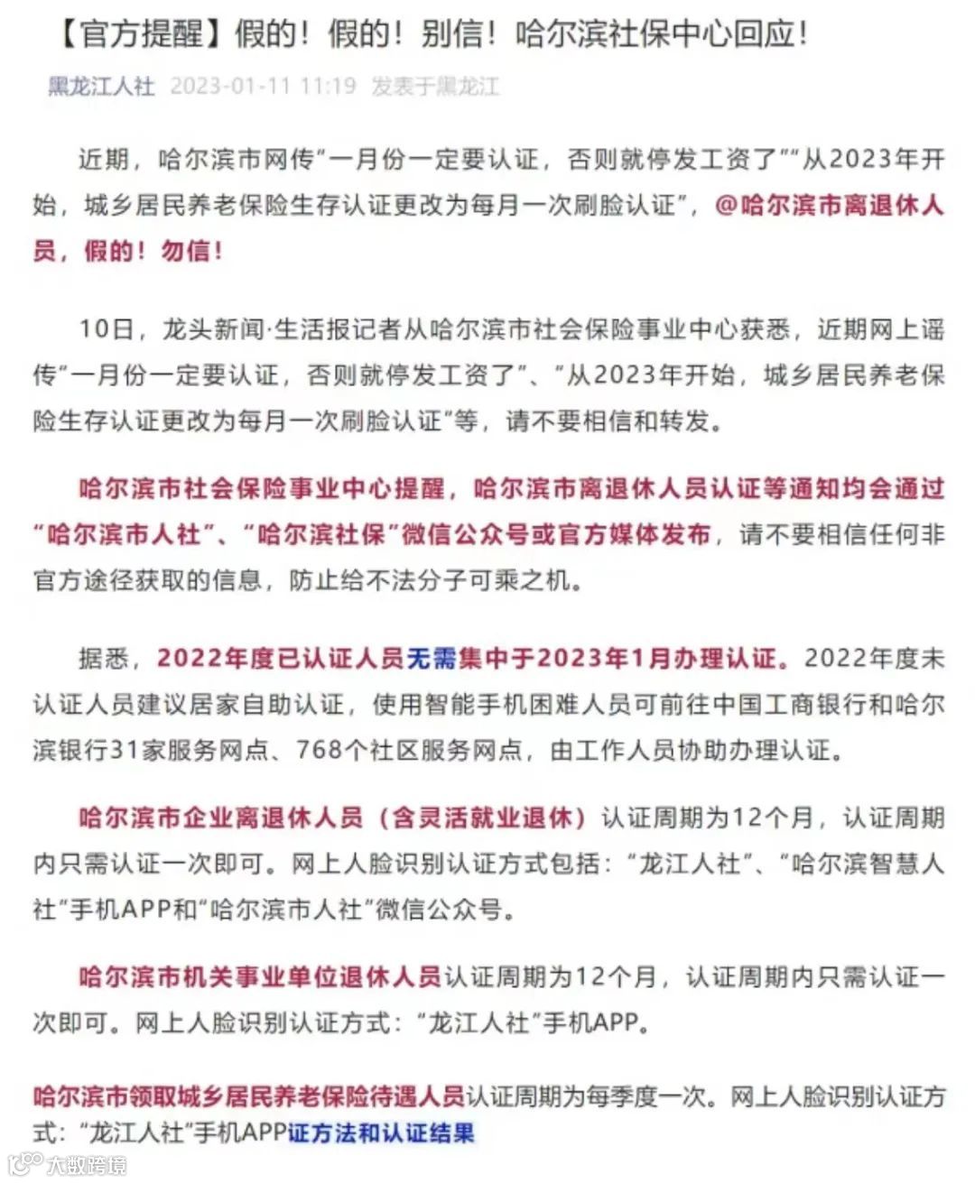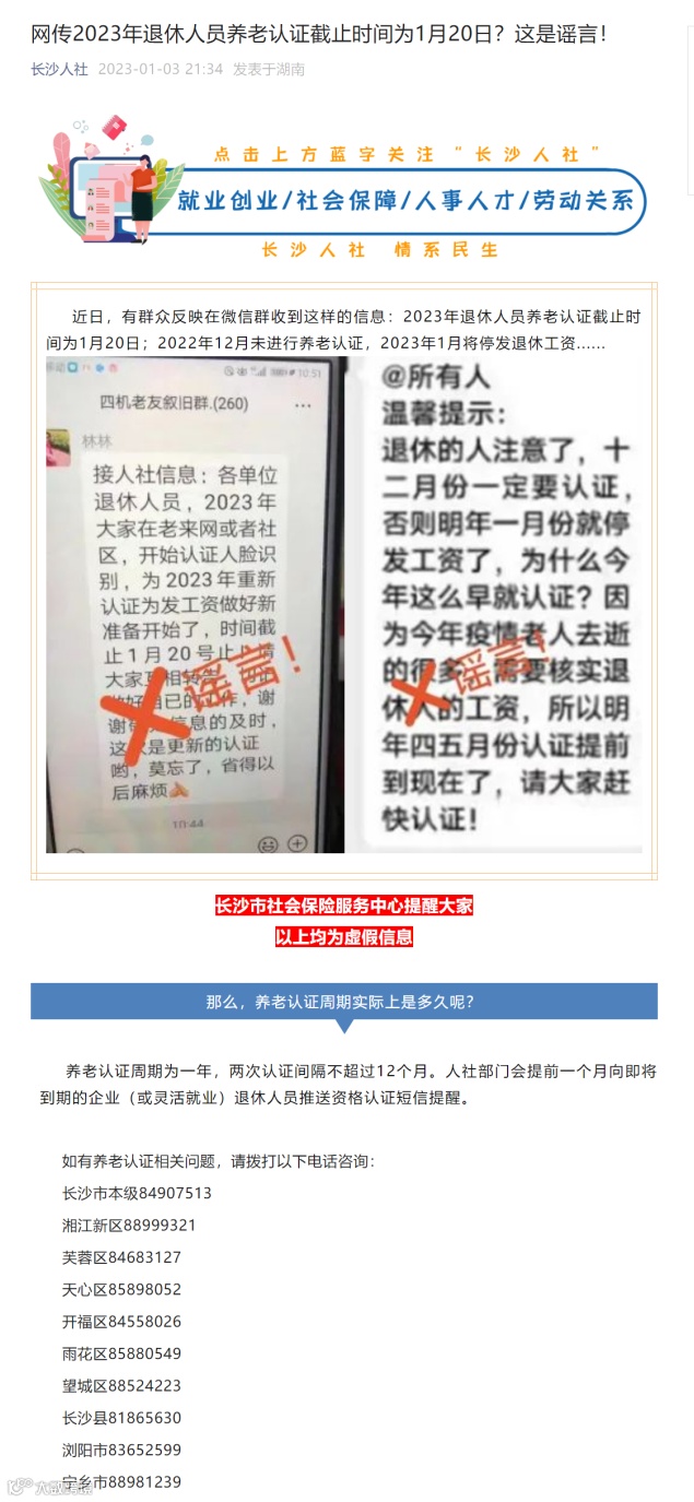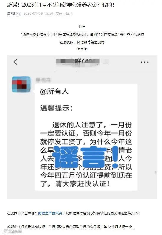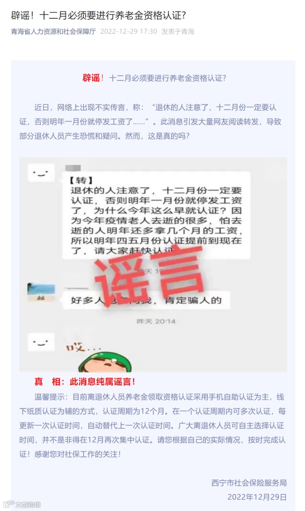 近日,多地网传“退休人员2022年12月一定要进行社保资格认证,否则工资停发”、“退休人员养老认证1月截止,否则停发养老金”、“因为今年疫情老人去世多,所以认证提前了”等信息。