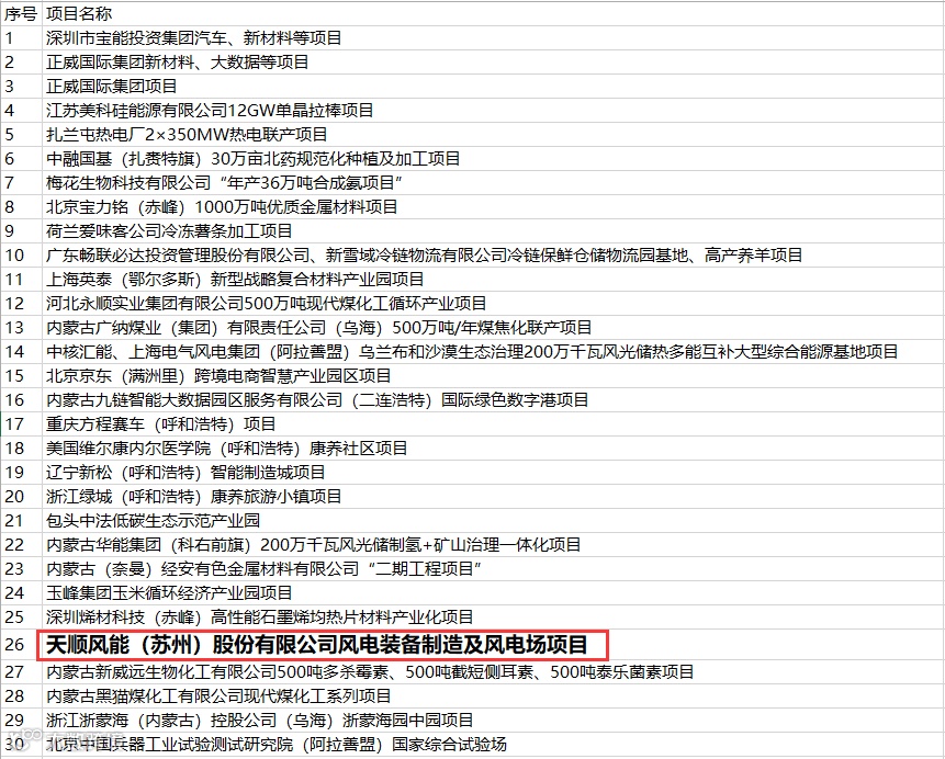 天顺风能在内蒙投资的风电装备制造及风电场项目作为自治区重点项目入选参加现场签约。该项目是乌兰察布市唯一一个获选参加现场签约的项目,同时也是签约现场为数不多的民营企业项目。新能源资产服务事业部北方公司总经理徐红义代表天顺风能集团参加了本次签约活动。