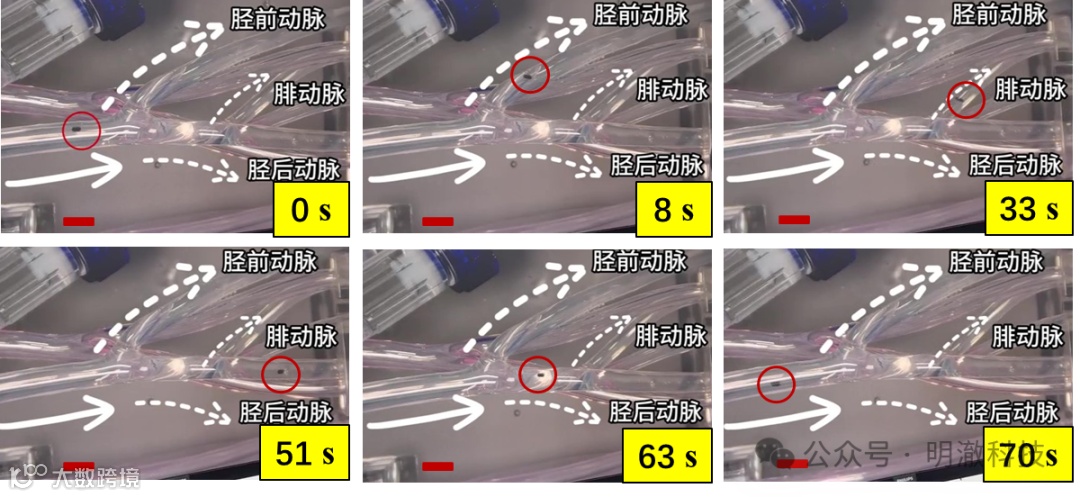 ●模型导航运动:根据影像反馈,实时改变外部旋转磁场的场强、频率、方向,控制微机器人在70s内顺利完成了在下肢腿部模型中全程导航,验证了微机器人优秀的多地形导航能力(图4)。