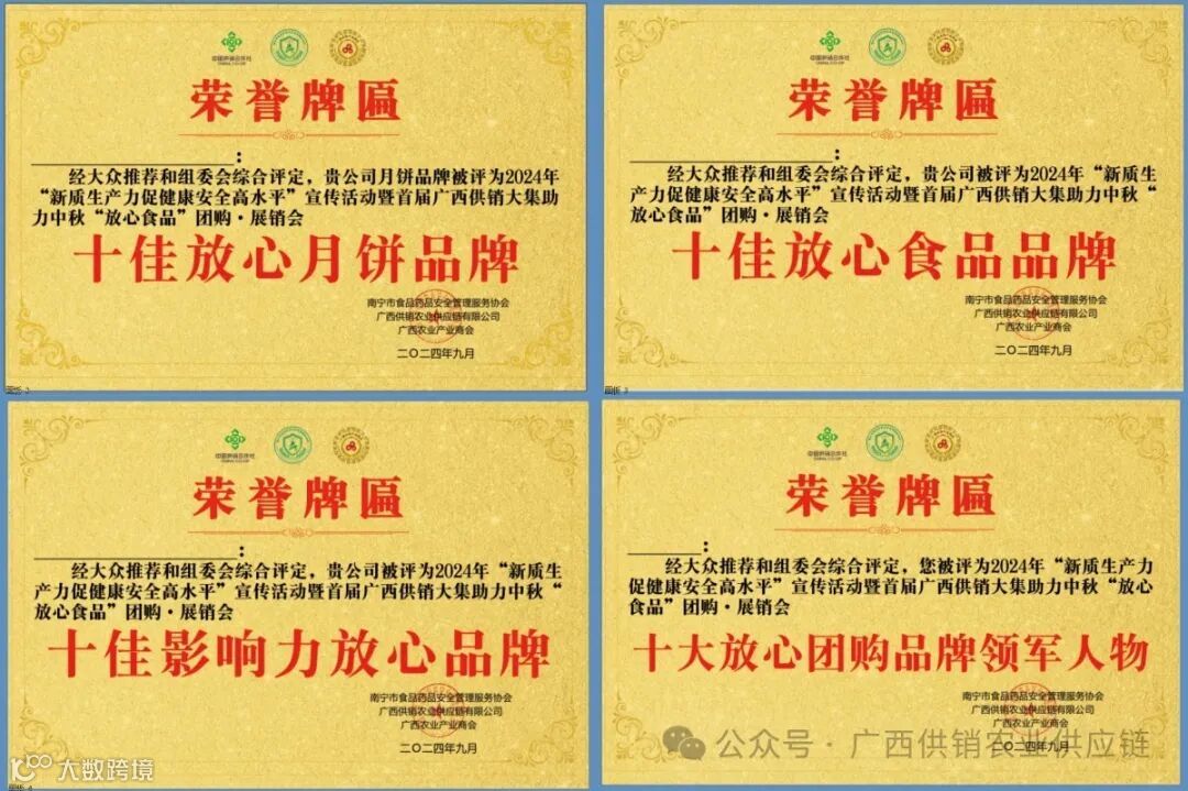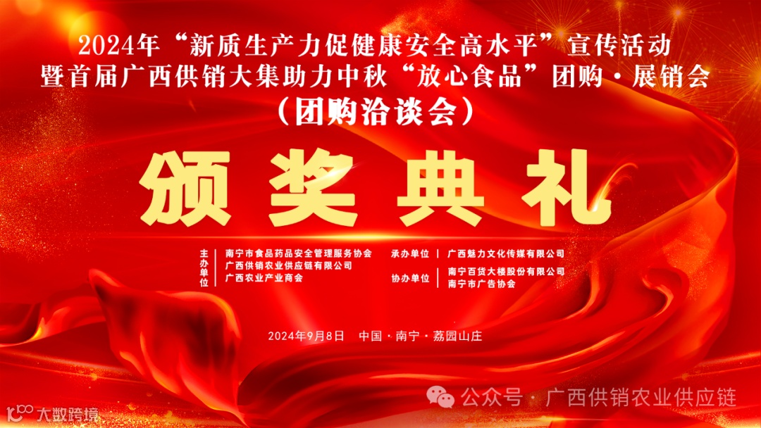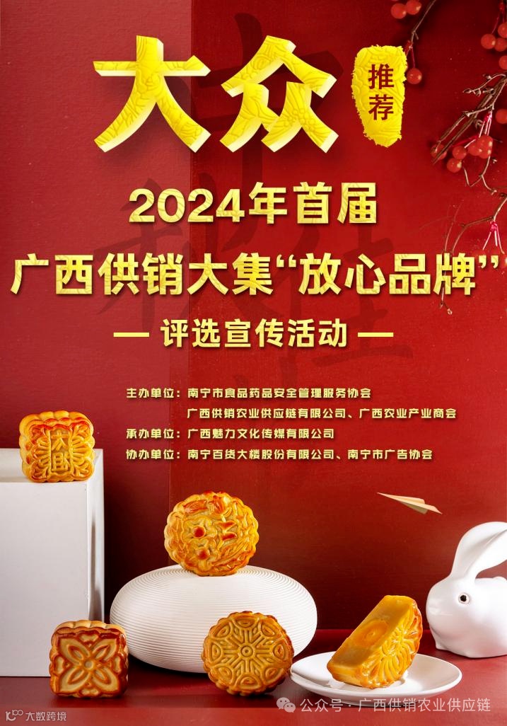 2024 年“新质生产力促健康安全高水平”宣传活动暨首届广西供销大集助力中秋“放心食品”团购·展销会,于2024年8月19日,在南宁市青秀区金湖广场 B1层举行了开幕式,100多家企业和品牌参展。为了更好地将“放心品牌”推荐给各相关单位、商协会、大企业工会等作为团购产品福利发放给员工、会员等,经组委会研究决定,于2024年9月2日9:00至2024年9月5日18:00,举行大众推荐“2024年首届广西供销大集‘十佳放心月饼品牌’、‘十佳放心食品品牌’、‘十佳影响力放心品牌’和‘十大放心团购品牌领军人物’”线上宣传投票活动,将由大众推荐助力等方式产生各大奖项,并于9月8日上午,在南宁荔园山庄隆重举行颁奖典礼暨“放心食品”团购洽谈会。