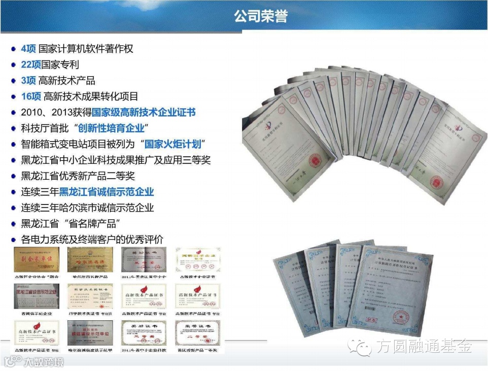 2、国家级高新技术企业,黑龙江省科技厅首批创新型培育企业。智能型箱式变电站工业化项目被列为“国家火炬计划项目”。