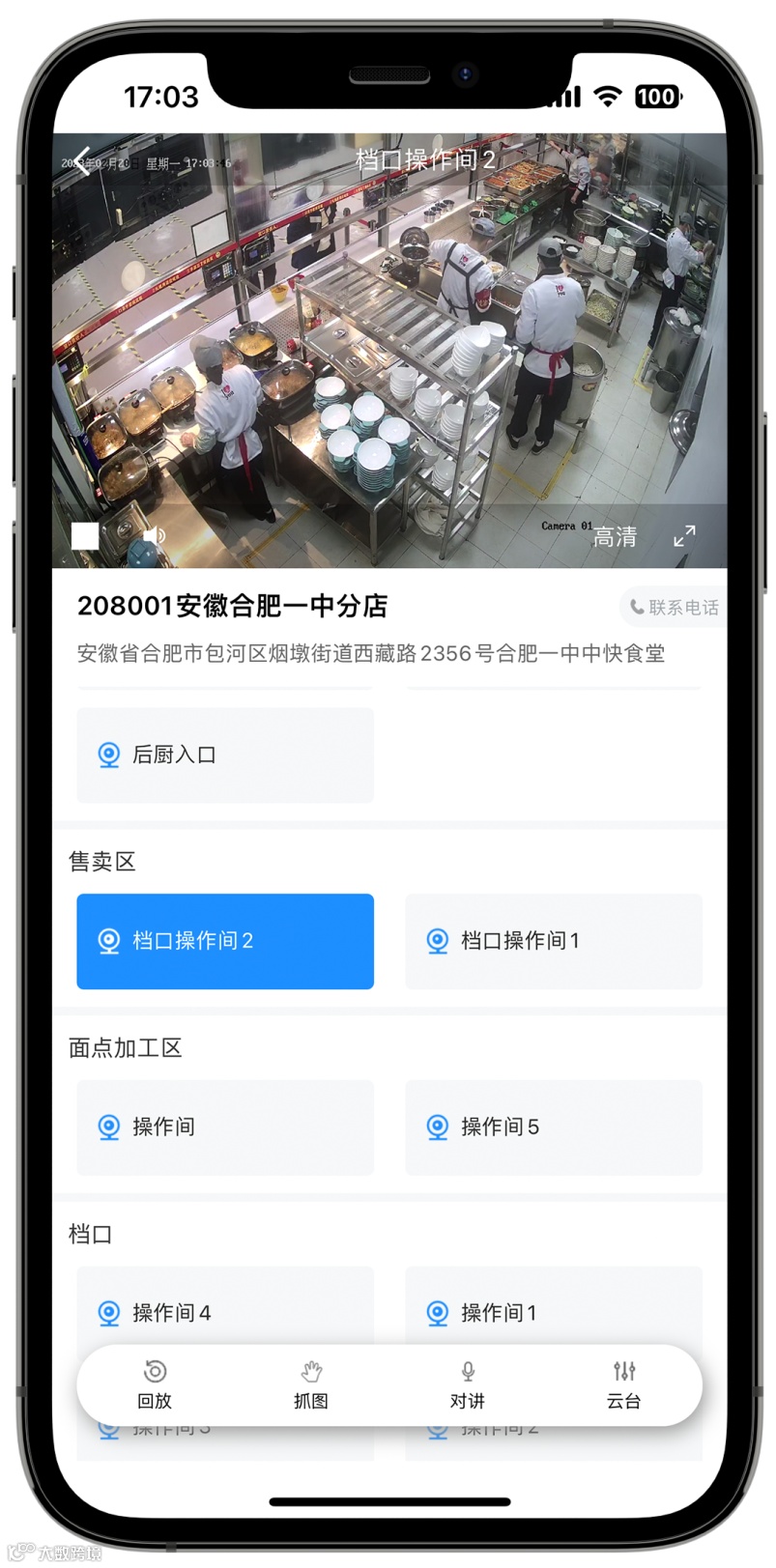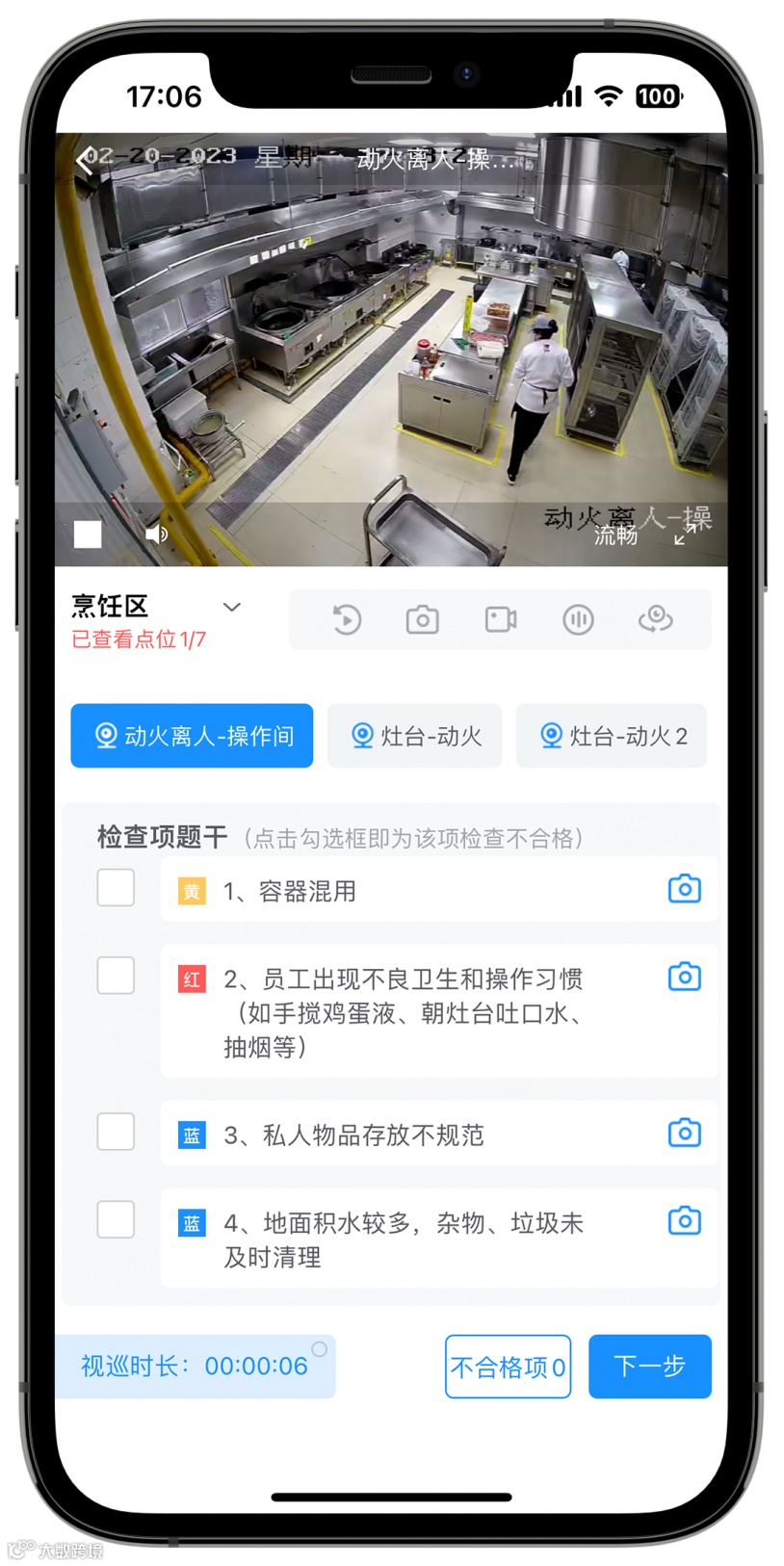 东贝食安建立“明厨亮灶 云巡检系统”,基于督贝督导管控平台的AI行为识别、视频监控、大数据分析等技术能力,实现对后厨食材加工各环节的远程监控、视频巡检、违规自动报警等功能,真正做到问题可查、责任可溯,促使食堂管理者、工作人员细致规范地完成后厨每一项操作流程。