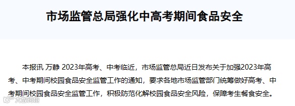 高考、中考临近,市场监管总局近日发布关于加强2023年高考中考期间校园食品安全监管工作的通知,要求各地市场监管部门统筹做好高考、中考期间校园食品安全监管工作,积极防范化解校园食品安全风险,保障考生餐食安全。