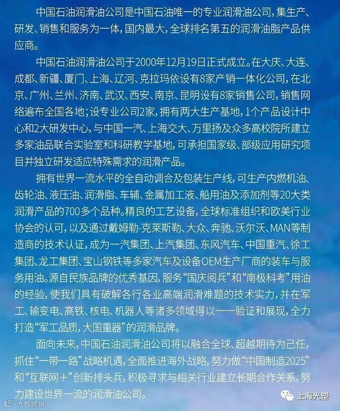 近日,上海光塑机械制造有限公司与中国石油上海润滑油分公司达成合作共识,为上海光塑的客户提供高品质的注塑机专用油。为了反馈客户关爱,及更好的服务上海光塑的客户,双方在当前各项成本日趋上升的情况下,决定共同努力,让利给客户,在本月底之前所有油品均按优惠价销售,详情请咨询各业务代表,或在本公众号留言,我们将尽快为您服务!
