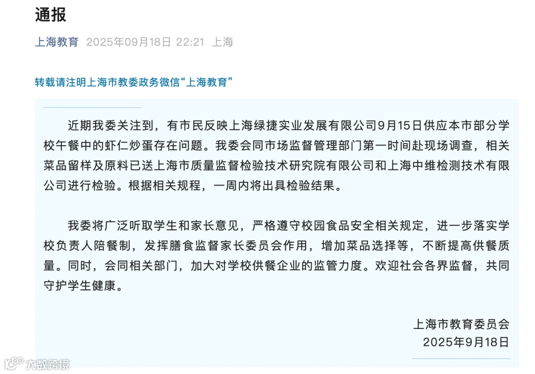 9月18日,上海市教育委员会发布官方通报:表示已会同市场监督管理部门第一时间赴现场调查,相关菜品留样及原料已送专业机构检验,一周内将出具检验结果。