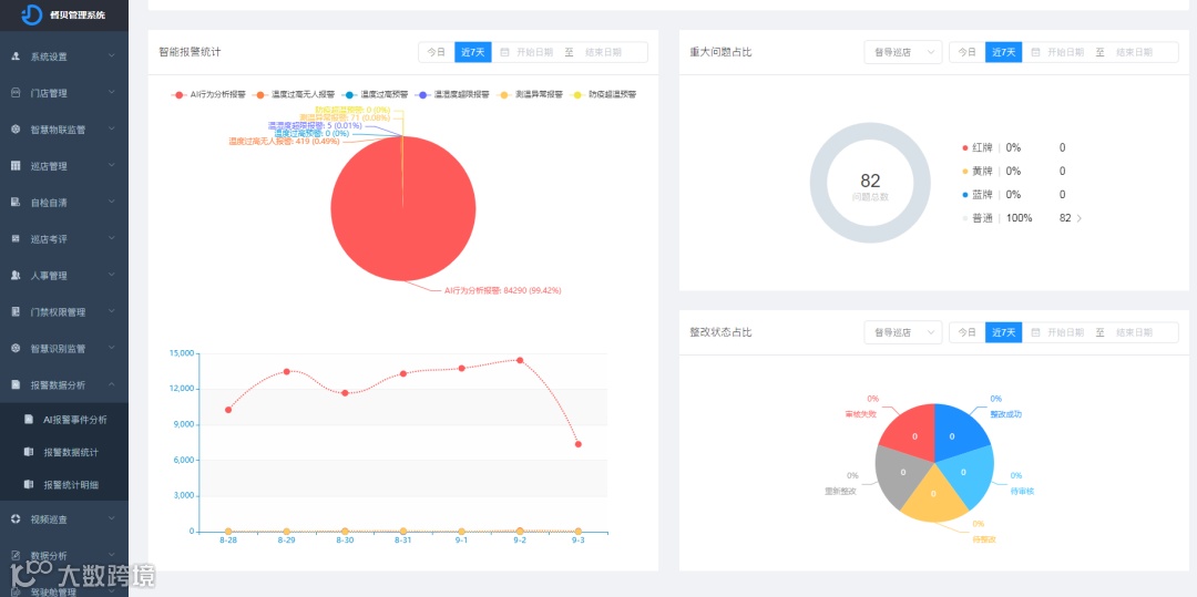 预警事件统计分析管理可汇聚门店所有的AI告警信息,并进行统计分析。管理人员可在智慧门店、督贝食安管控平台直接查看门店报警实时提醒、报警事件统计、当日实时报警趋势、报警时间占比等内容,进行违规事件取证,提出针对性的修改建议,强化后厨食安管理。