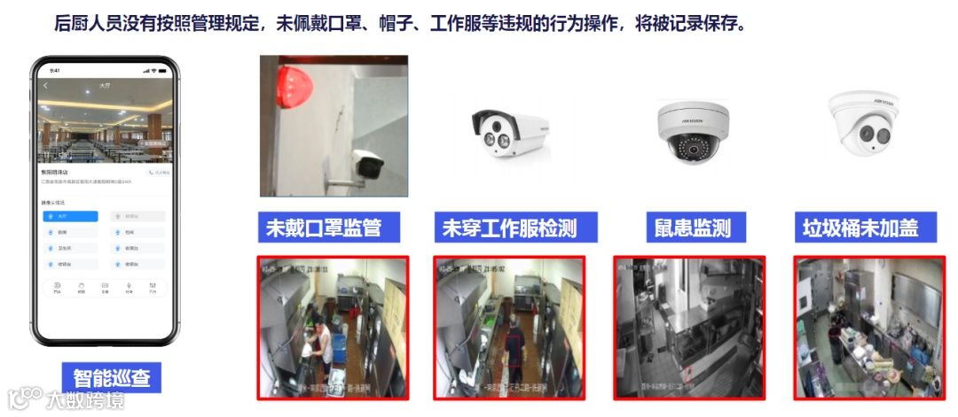 但同时,透明玻璃和视频监控的形式也存在缺陷。若想及时发现员工的不规范行为与实时提醒,需要专人长时间关注,耗费人力;并且,由于食堂后厨有部分场所需对食监局公开,需要专人到实地巡检,会出现巡检人力成本高、效率低、监管结果无法保证公开透明等问题。