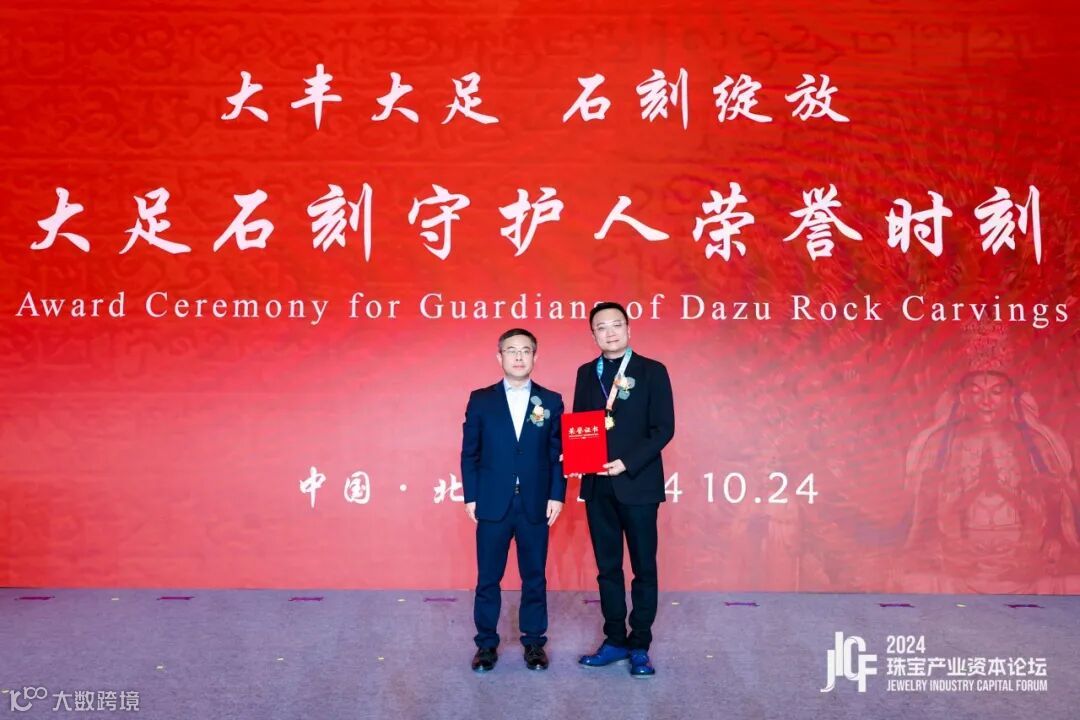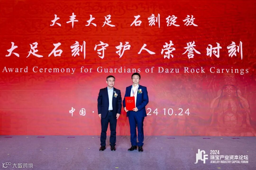 论坛期间,重庆市大足区委常委、组织部部长张明为中国珠宝首饰进出口股份有限公司总经理张宇波与深圳市华灵隆珠宝文化科技有限责任公司总经理苗志国颁发了“大足石刻守护人”荣誉证书。
