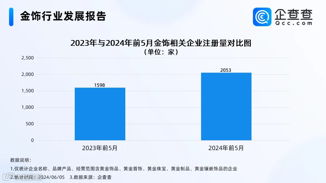 企查查数据显示,今年1-5月,国内金饰相关企业新增2,053家,较上年同期增长28.47%。