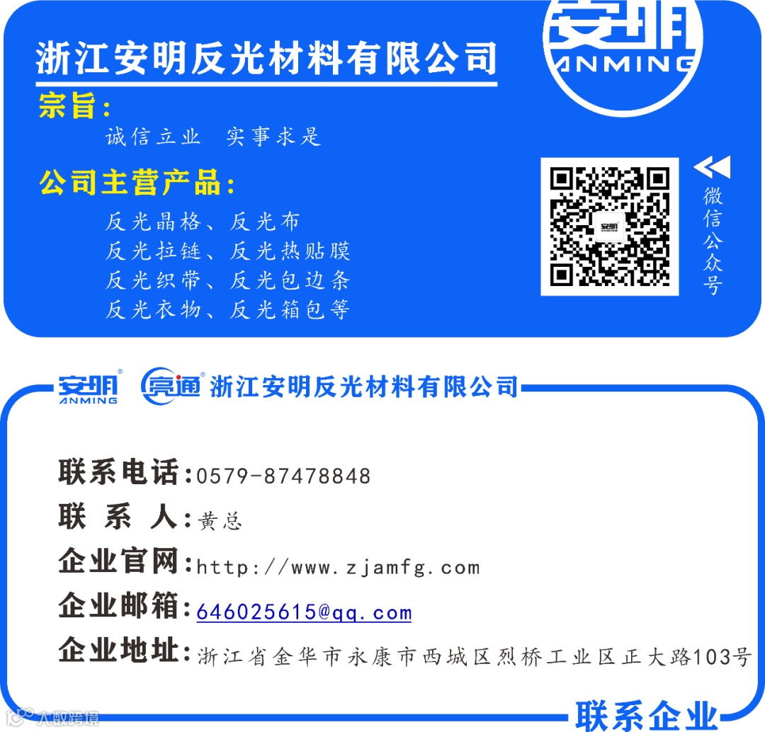 浙江安明反光材料有限公司(以下称:安明反光)是一家专业从事新型反光材料应用、设计、销售与服务为一体的高新技术企业,公司产品涵盖箱包、衣帽、鞋及其它民用品。