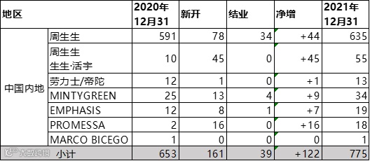 2021年,周生生内地门店总数净增122家,为近年最高,体现出内地市场消费向好的势头,也一定程度说明了年内销售及分销费用的支出流向。