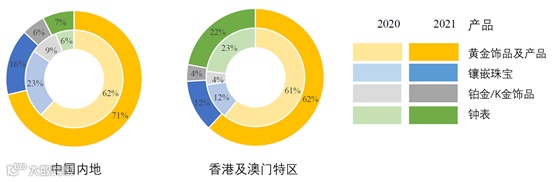 香港及澳门特区的产品结构较2020年变化较小,黄金、镶嵌、钟表三类产品销售额增幅相对较为接近,均在20%~30%附近。