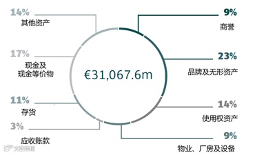 资产方面,总资产同比增长10.9%至310.68亿欧元,资产结构如下图所示,可以看出与国内珠宝上市企业相比,奢侈品集团的存货占比较低,而品牌及无形资产的占比较高。