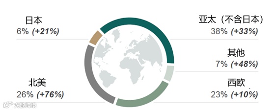 图. 开云集团2021年各区域市场份额占比及该区域销售额增幅
