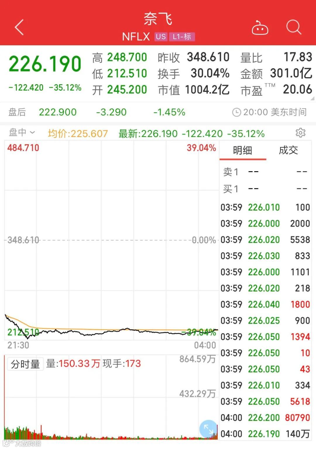 4月20日,奈飞开盘便遭抛售,股价一路下跌,最终报收226.19美元,总市值跌至1005亿美元,较前一交易日蒸发超543亿美元。