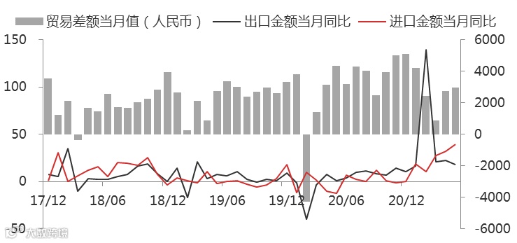 据海关总署数据,以美元计,中国6月出口同比增32.2%,预期增21.4%,前值增27.9%;进口增36.7%,预期增26.2%,前值增51.1%。以人民币计,中国6月出口同比增20.2%,预期增14%,前值增18.1%;进口增24.2%,预期增20.4%,前值增39.5%。